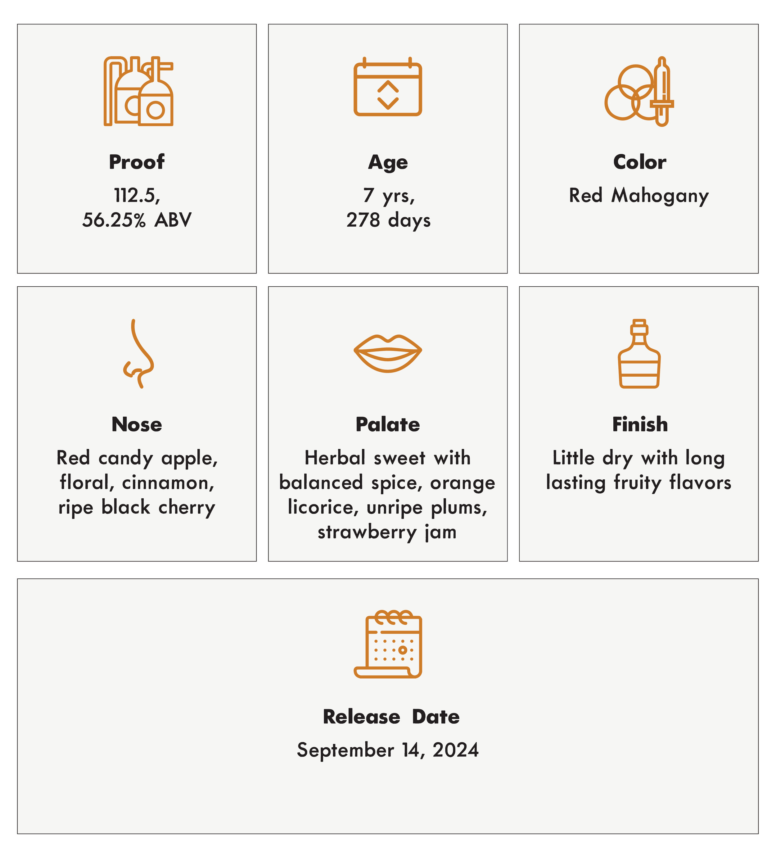Not only did Head Distiller Daniel Joslin hand-select Barrel #1413 for his Distiller’s Select, he actually distilled it himself over seven years ago! Aged for 7 years and 278 days, this 112.5-proof bourbon features a fruit-forward flavor profile with herbal sweetness and balanced spice. Daniel recommends enjoying this one over ice!